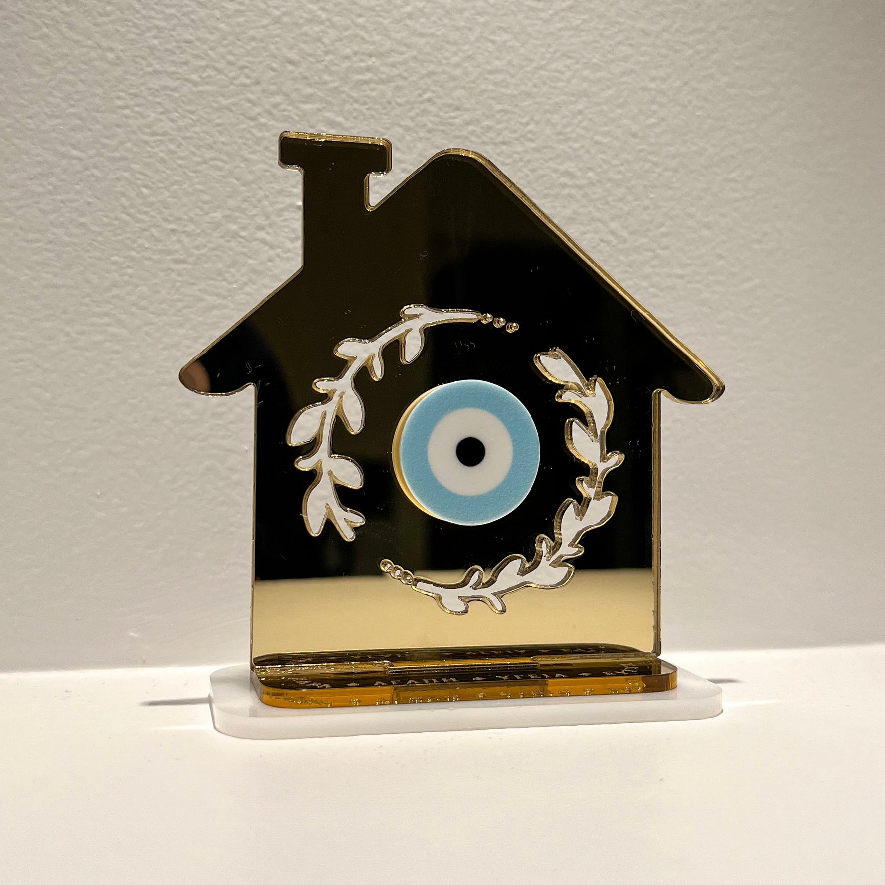 Enhance your home decor with the Gouri Plexiglass Gold House Handmade in Greece, this table good luck charm features a stunning 9.5 x 8 cm plexiglass evil eye embellished for protection. The metallic parts are expertly plated in 24K gold.