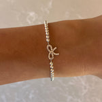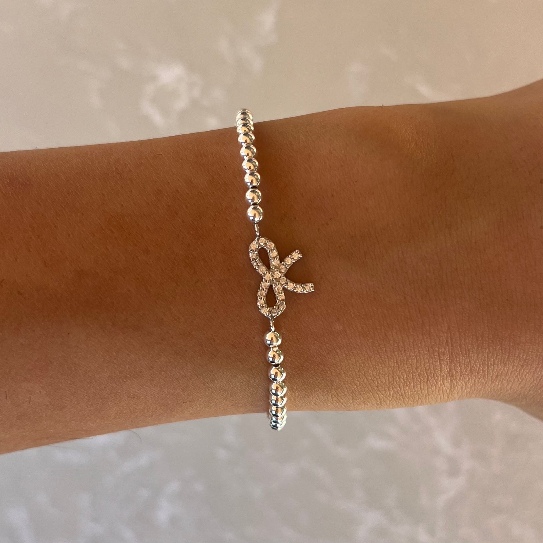 Handmade 925 Sterling Silver Beaded Bow Elastic Bracelet With Cubic Zirconia.