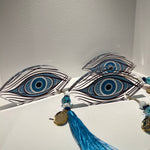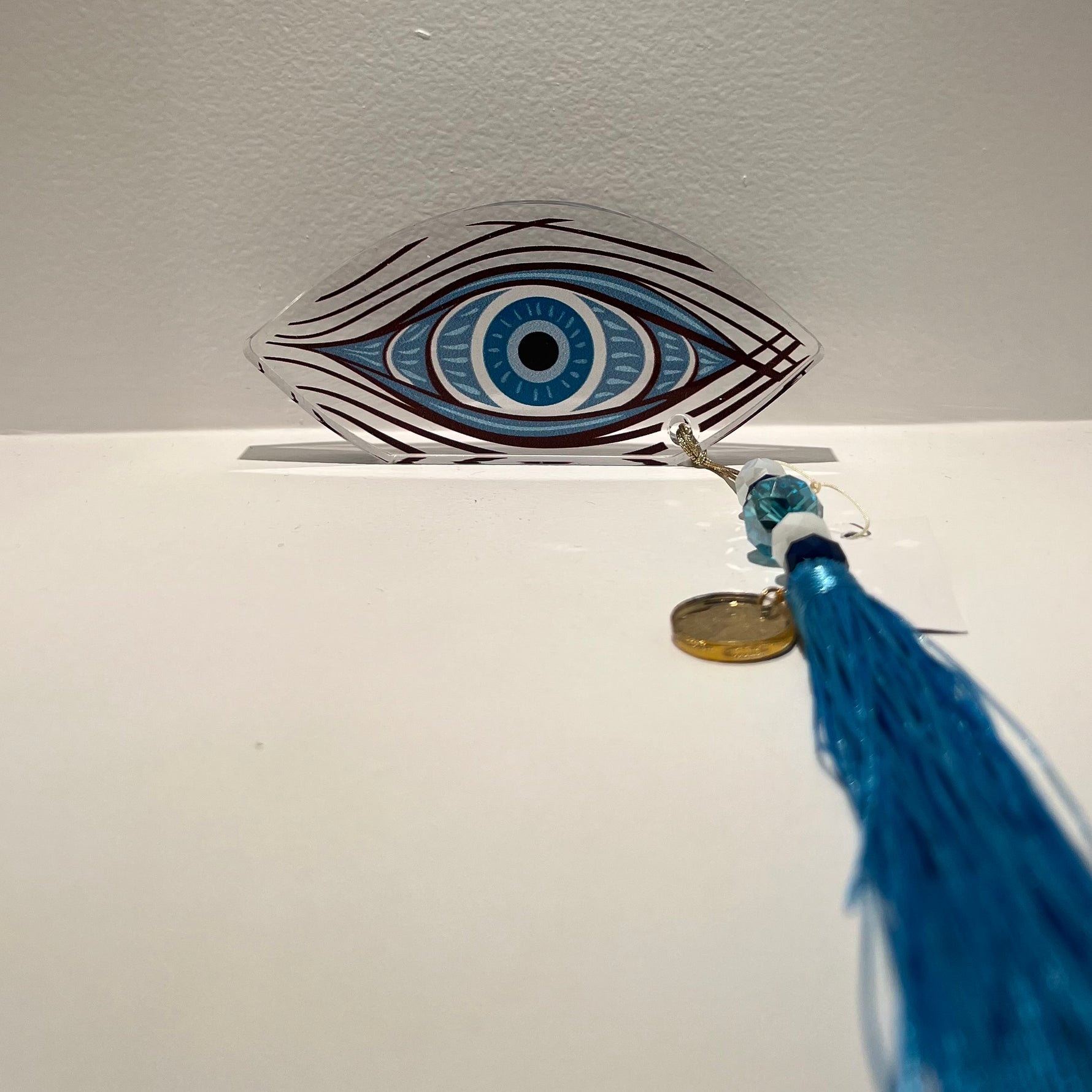 Enhance your home decor with the Gouri Plexiglass Gold House Handmade in Greece, this table good luck charm features a stunning 23 cm plexiglass evil eye embellished for protection including tassel.