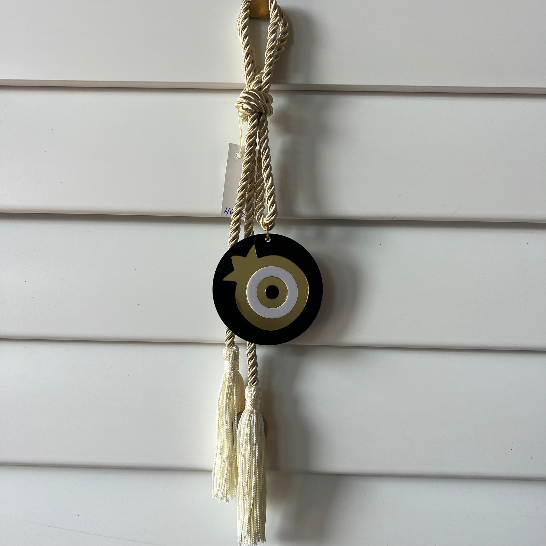 Greek Gouri Eye Plexiglass. Handmade with high quality plexiglass, this summer lucky charm features an evil eye design, adding protection to your home. The handmade silk tassel and braided cord add a touch of luxury to the 30 cm long charm. Made in Greece.