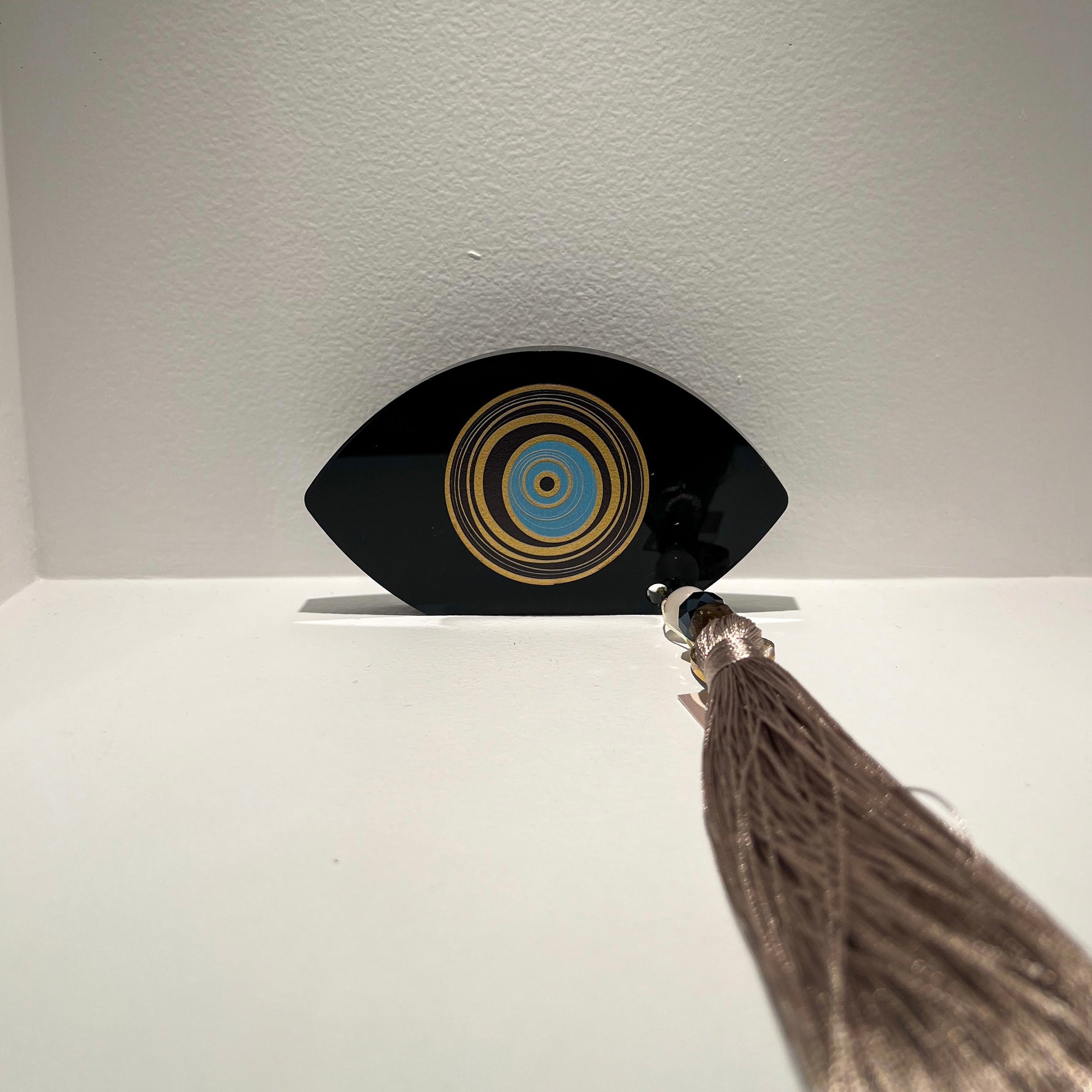 Enhance your home decor with the Gouri Eye Plexiglass. Handmade in Greece, this table good luck charm features a stunning 12 cm plexiglass evil eye embellished for protection. The metallic parts are expertly gold plated, while a luxurious silk tassel adds a touch of elegance.