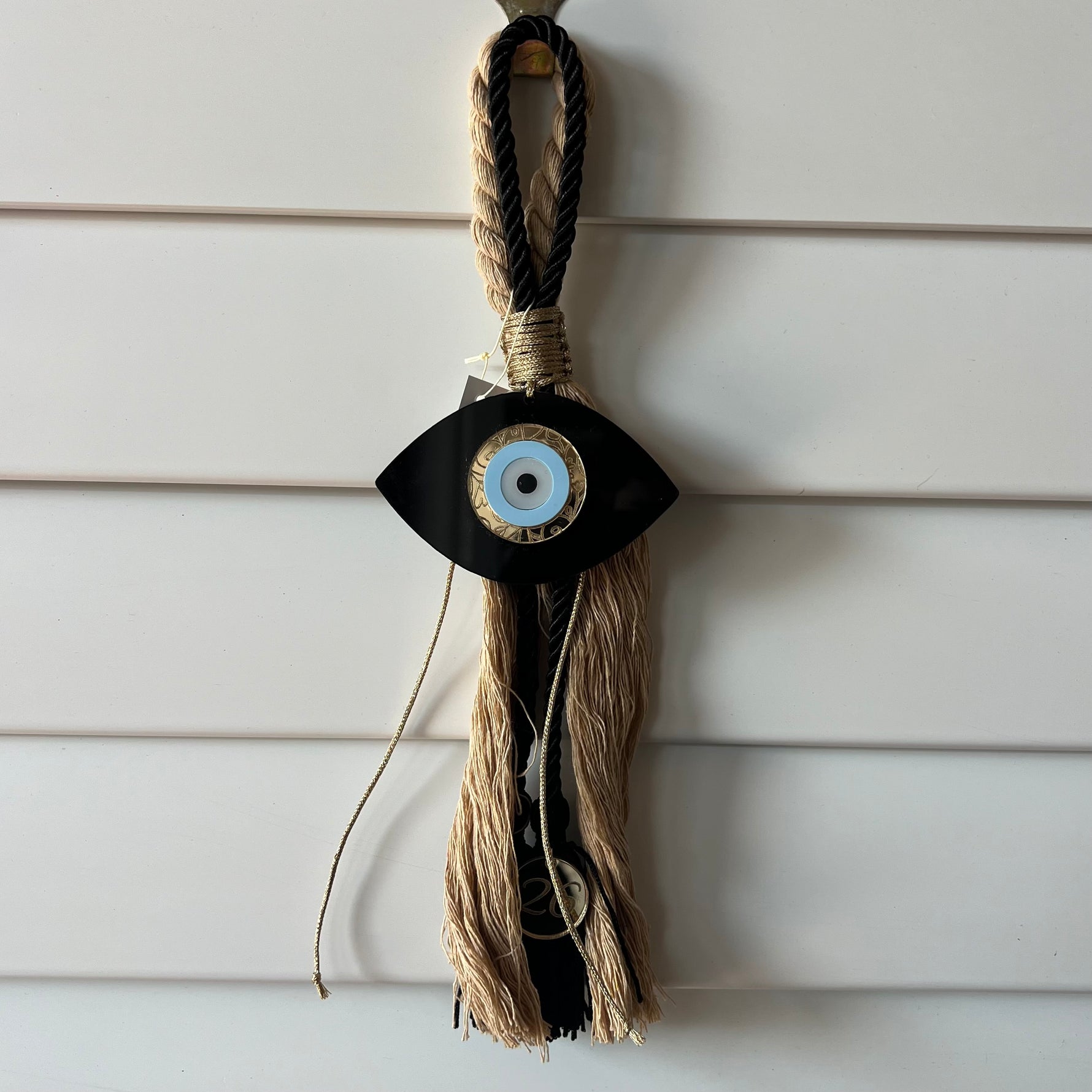 Greek Gouri Eye Plexiglass. Handmade with high quality plexiglass, this summer lucky charm features an evil eye design, adding protection to your home. The handmade silk tassel and braided cord add a touch of luxury to the 30 cm long charm. Made in Greece.