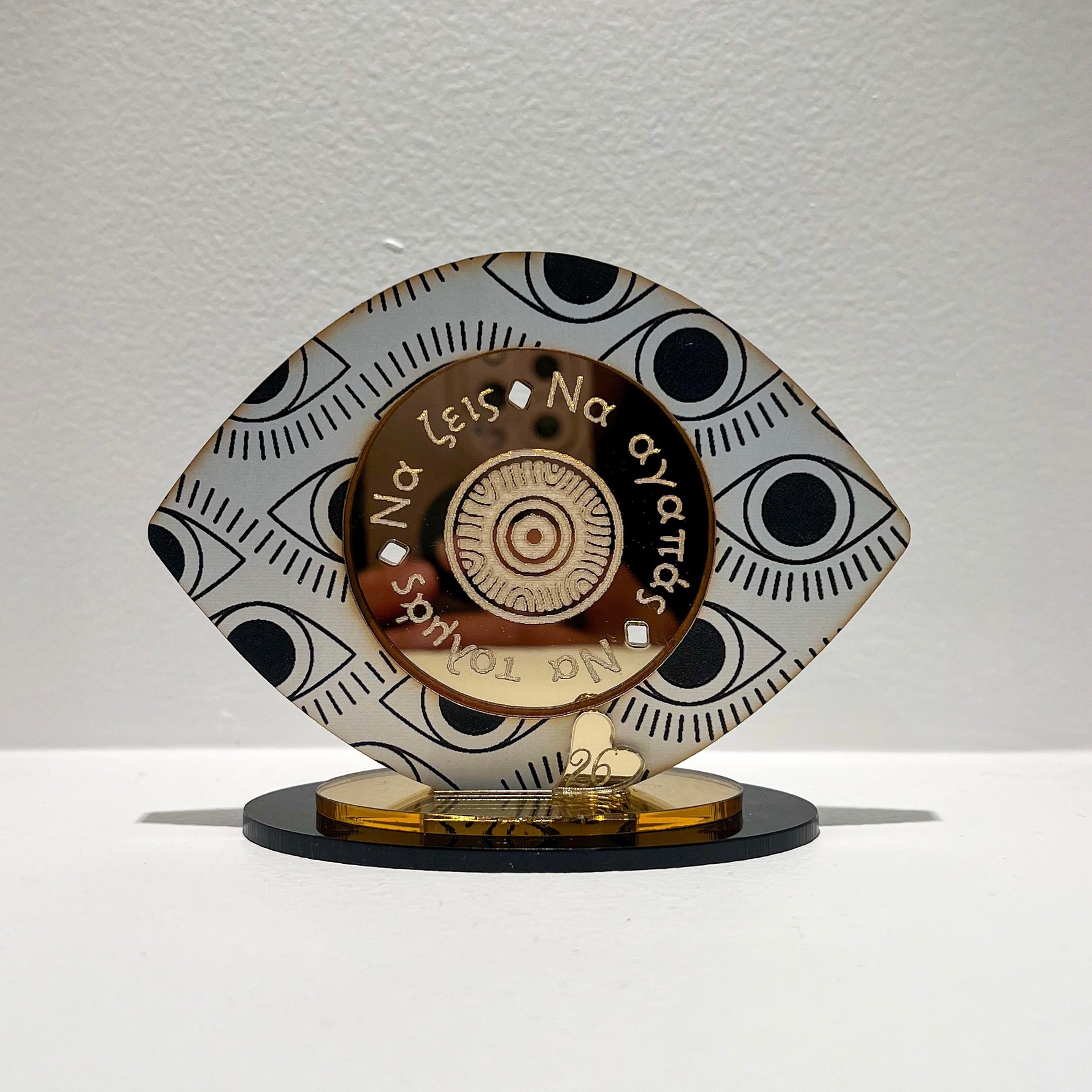 Enhance your home decor with the Gouri Eye Plexiglass. Handmade in Greece, this table good luck charm features a stunning 11 x 8 cm plexiglass evil eye embellished for protection. The metallic parts are expertly plated in 24K gold.