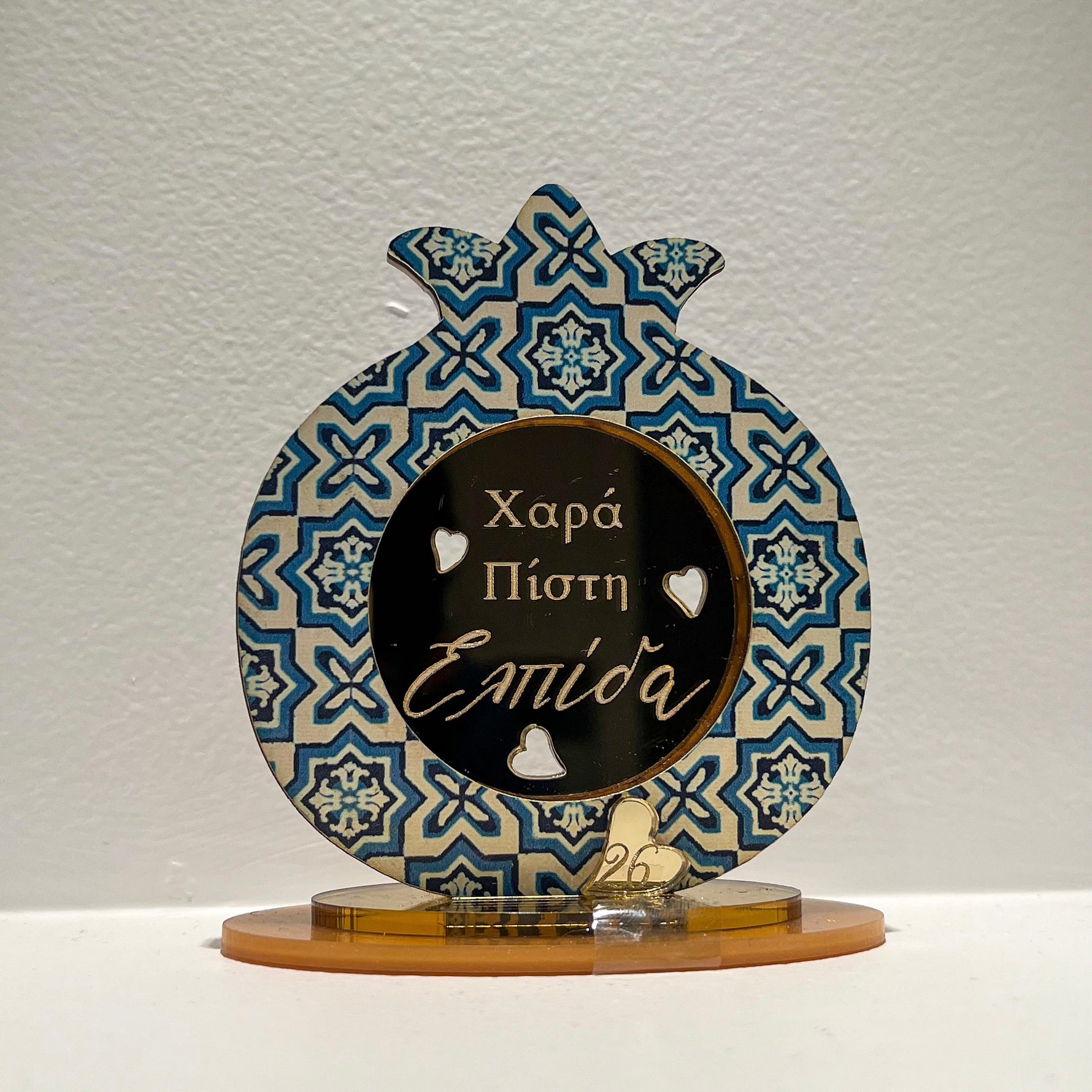 Enhance your home decor with the Gouri Plexiglass pomegranate with writing of Joy, Faith and Happiness. Handmade in Greece, this table good luck charm features a stunning 10 cm plexiglass evil eye embellished for protection. The metallic parts are expertly plated in 24K gold.