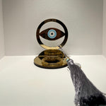 Enhance your home decor with the Gouri Eye Plexiglass tea light holder. Handmade in Greece, this table good luck charm features a stunning 10 cm plexiglass evil eye embellished for protection. The metallic parts are expertly plated in 24K gold while a luxurious silk tassel adds a touch of elegance.