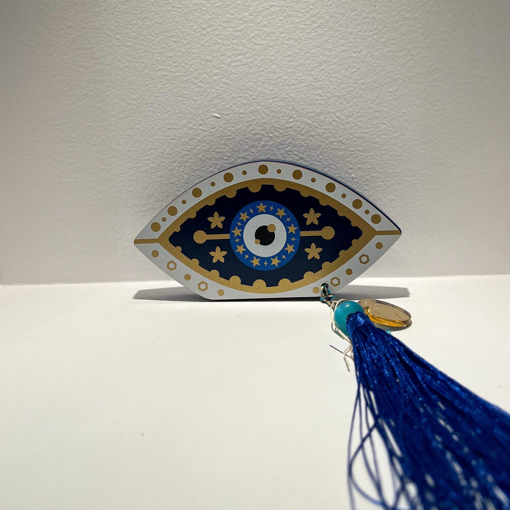 Enhance your home decor with the wooden Gouri Eye. Handmade in Greece, this table good luck charm features a stunning 13 x 7 cm wooden evil eye embellished for protection. With a luxurious silk tassel adds a touch of elegance.