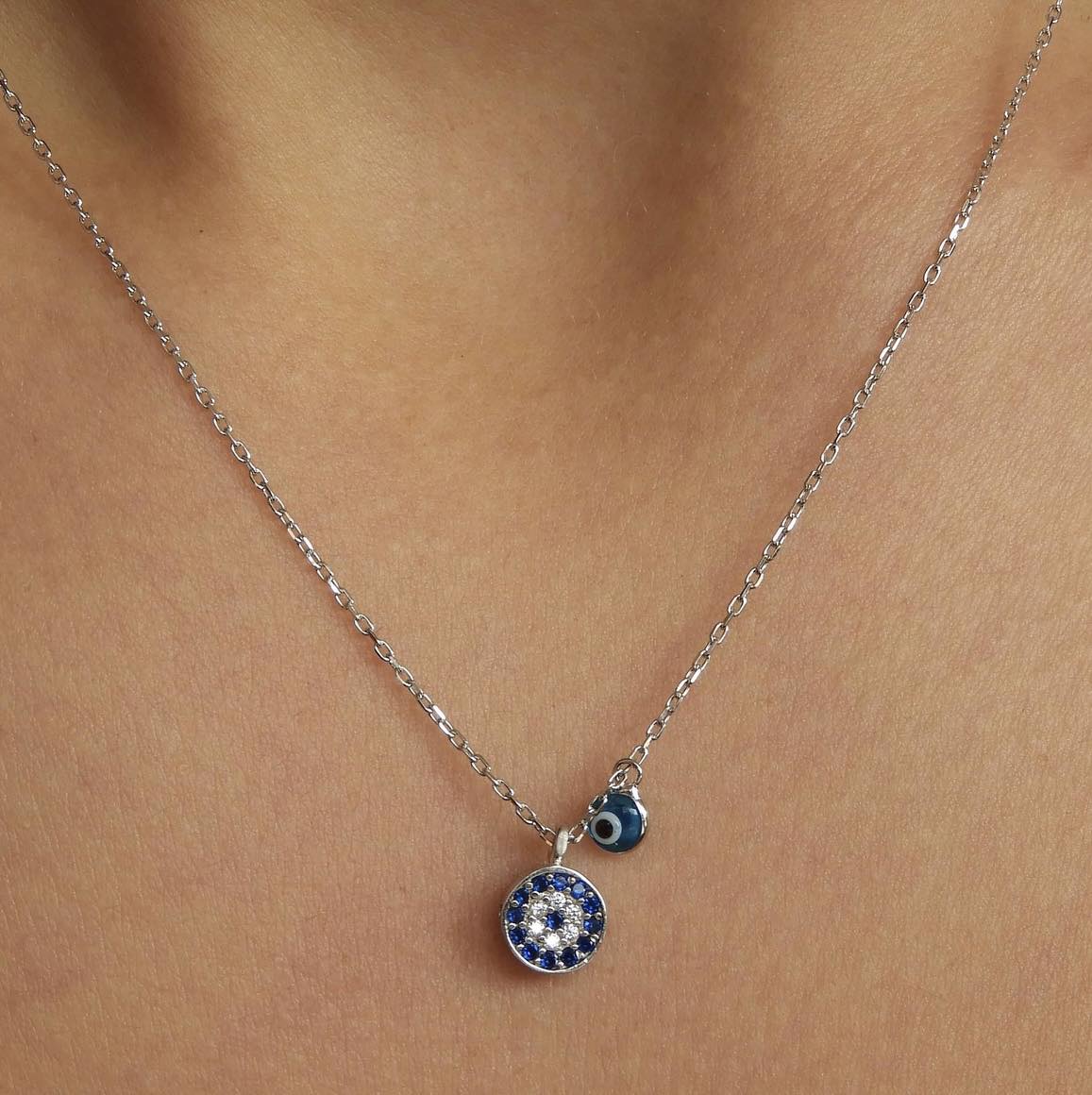 Handmade 925 Sterling Silver Double Evil Eye Necklace With Cubic Zirconia.