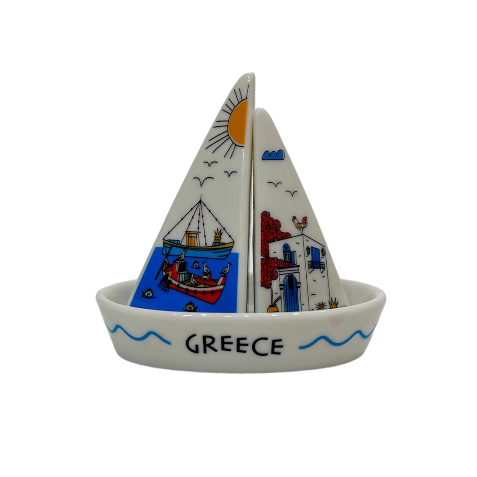 Handmade porcelain salt n pepper shakers with sunset pattern and tray.