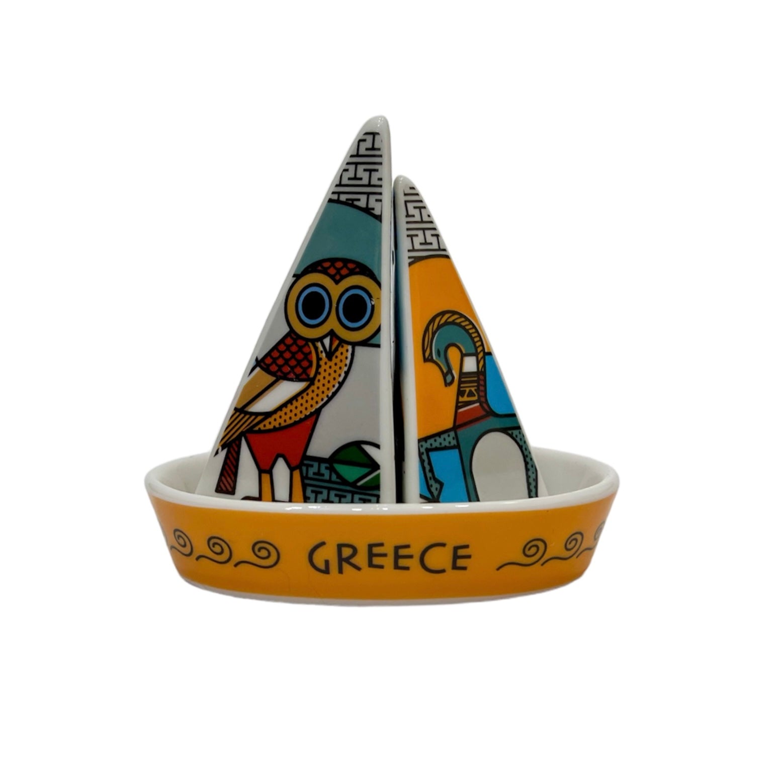 Handmade porcelain salt n pepper shakers with Trojan pattern and tray.